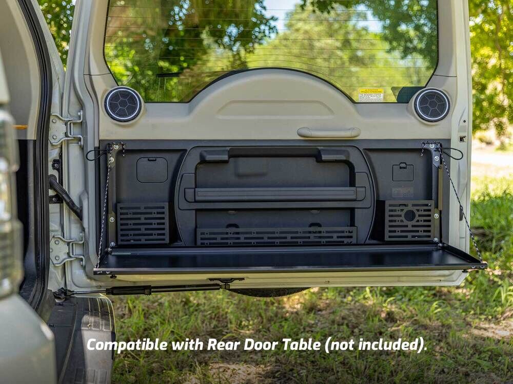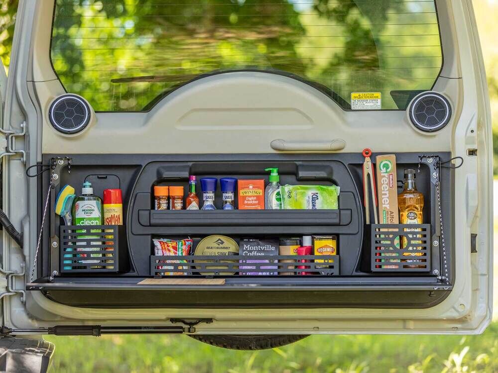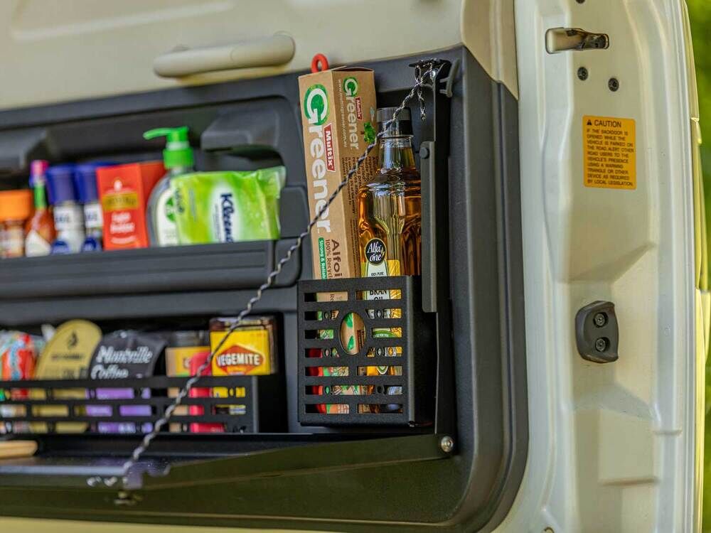 Our Centre Cage creates functional and easy-access storage under the factory trim cover. The addition of Pocket Cages maximises your setup, taking blank recesses on the rear door and turning them into useful spaces. Simply add the table, and you've got a kitchen setup that'll be the envy of the campground.