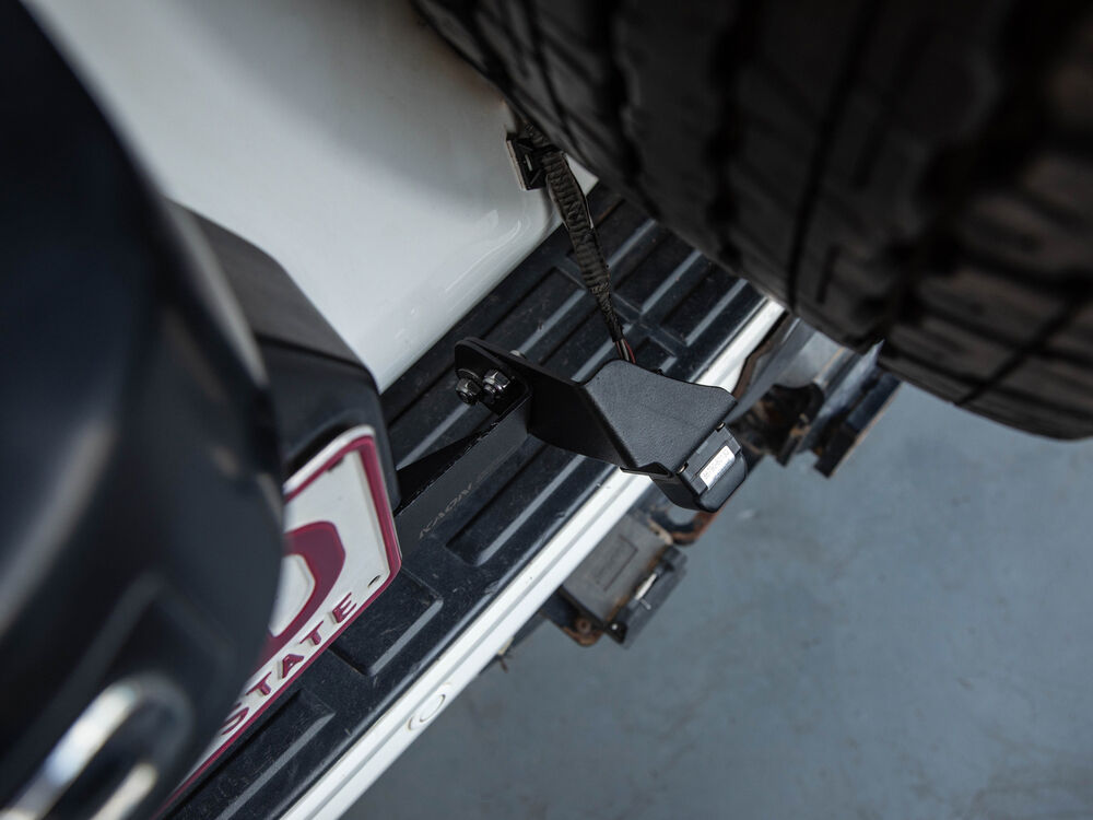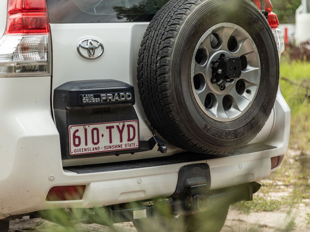Please note: this installation requires drilling into the bottom of the number plate mount, but there’s no need to remove the door trim. The factory wheel cover is not compatible with this bracket installed.