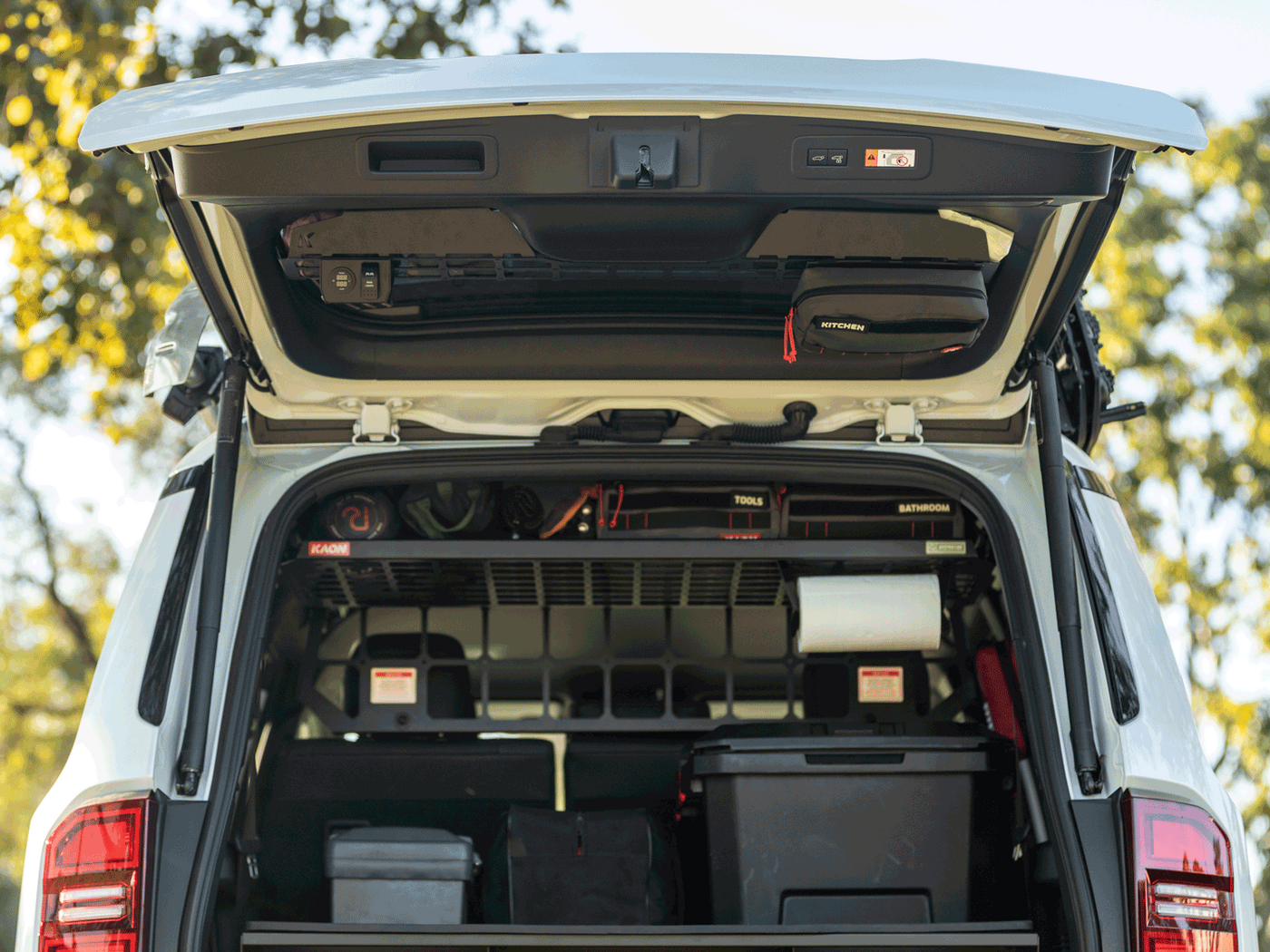 The Console is compatible with the OEM storage box found in 5 and 7-seater models. 125mm clearance is required from the door to aftermarket accessories, including dividers/fridges or drawers. See FAQ for details.