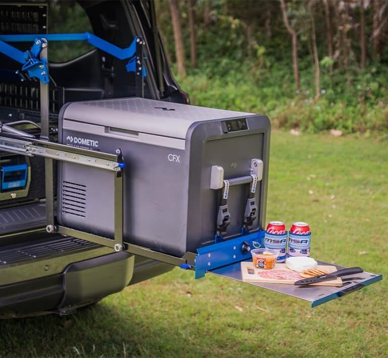 Perfect for preparing a quick meal for the family when on the road. The Drop Slide lowers 30 centimetres while extending over the tailgate of the vehicle, allowing easy access to a fridge, toolbox or generator. The slide remains in a horizontal position when lowering, avoiding any contact with the vehicle.