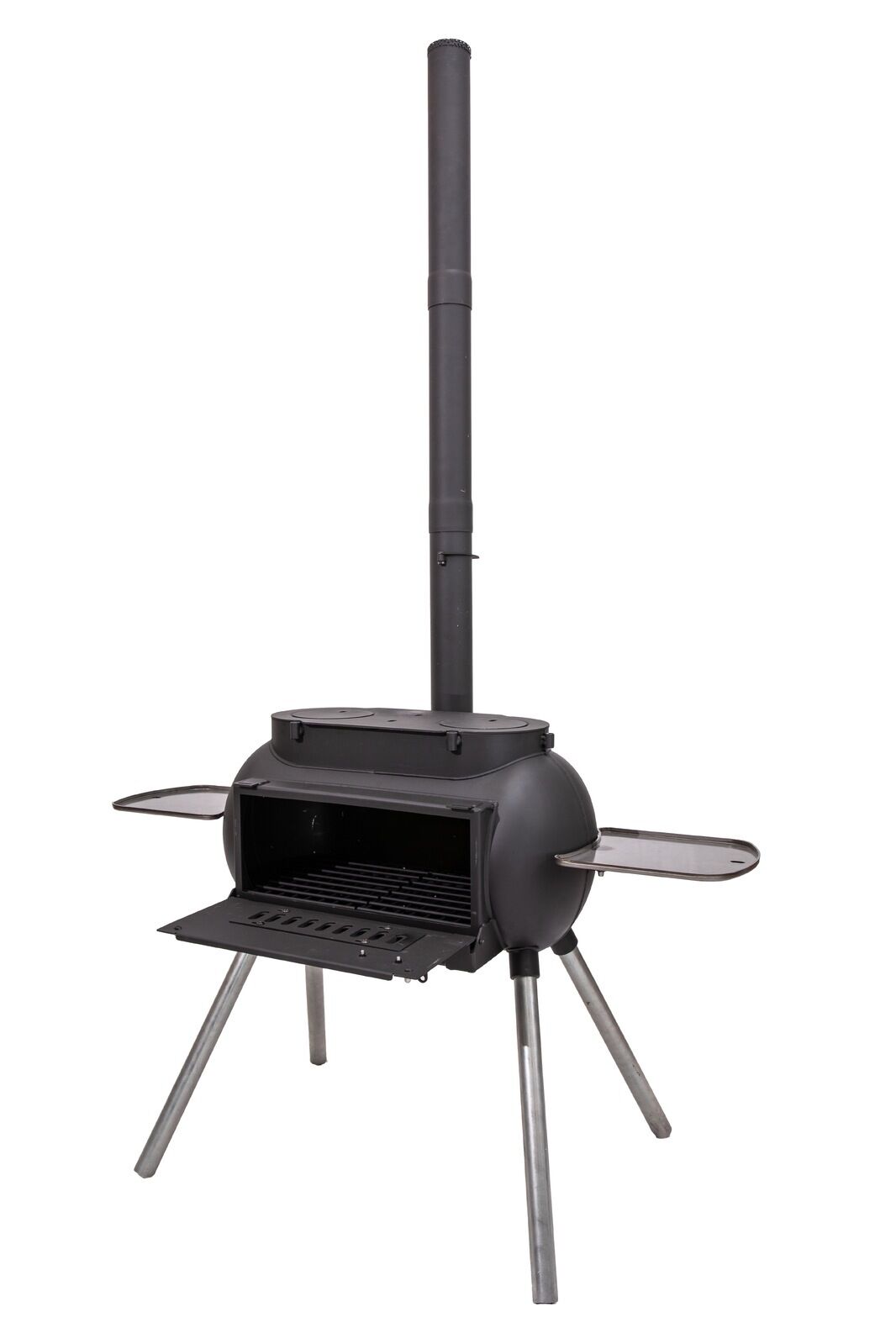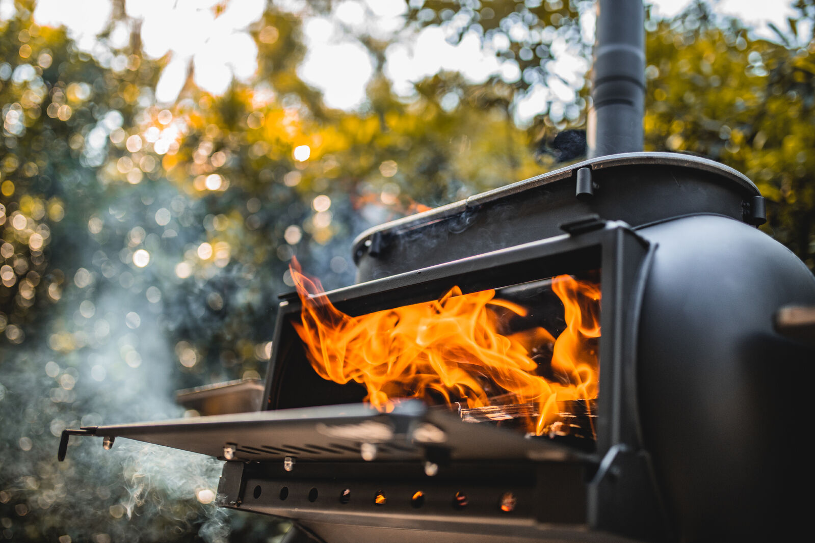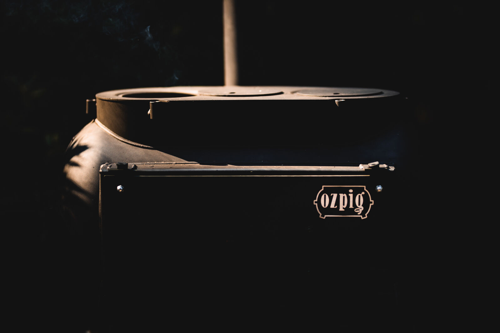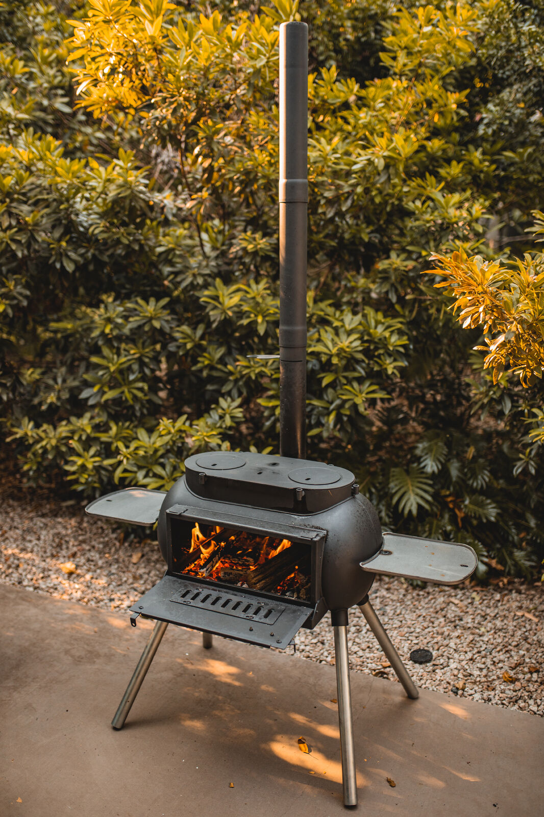 The Big Pig features essential safety requirements such as a solid bottom, ensuring we capture all our own ash so nothing can fall out onto the ground. The folding door at the front of the Big Pig acts an ashtray and can be fully closed to contain the fire, while the spark arrestor on top of the chimney drastically reduces the chance of embers flying out and potentially starting dangerous spot fires.