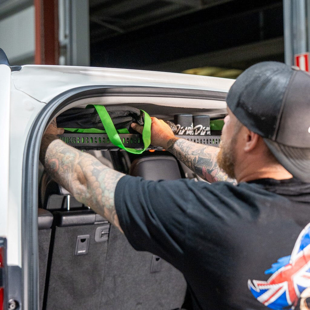 A clutter-busting champion - Pirate Camp Co's Rear Roof Parcel Shelf offers dual storage capabilities, clearing up precious cabin space and keeping your essentials within easy reach on the road.