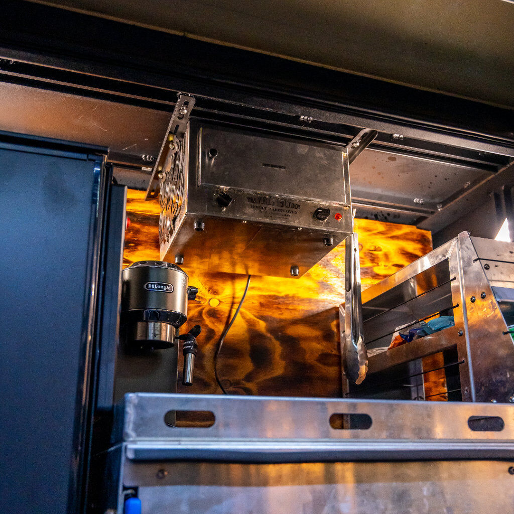 Sleek, tidy and aesthetically pleasing Travel Buddy Oven mounting bracket. Utilises the existing uni-struts in the roof of your canopy, but is not limited to this. You can mount it on an existing false panel in the roof, or under shelves the posabilities are endless.