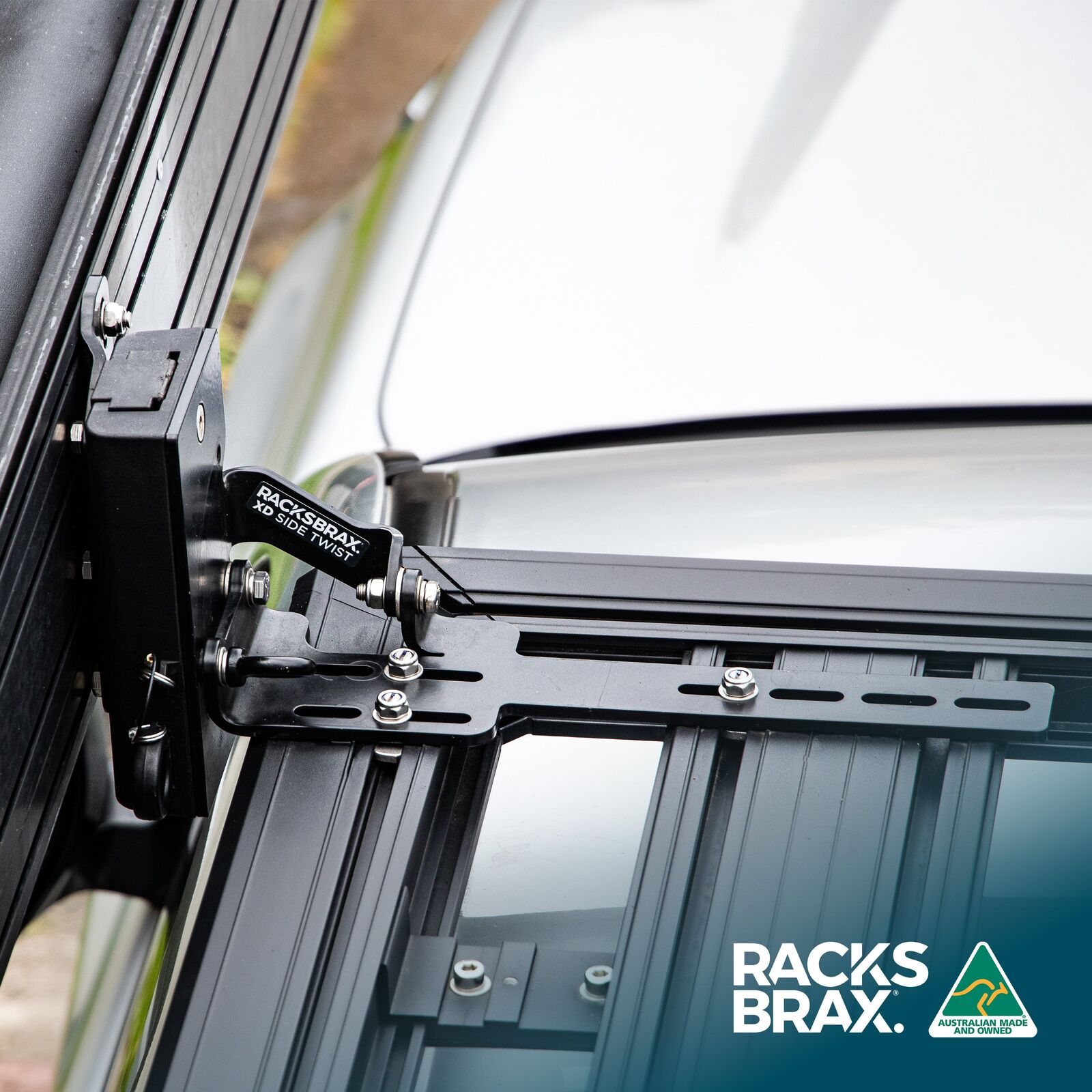 This bracket MUST be accompanied with the RacksBrax quick release XD Hitch. Simply remove the awning in a few seconds using the XD Hitch. To stow, unscrew the eyebolt , twist the bracket 90 degrees from the vertical to the horizontal reducing headroom to 50mm, screw in the eyebolt. No tools … it’s that easy!