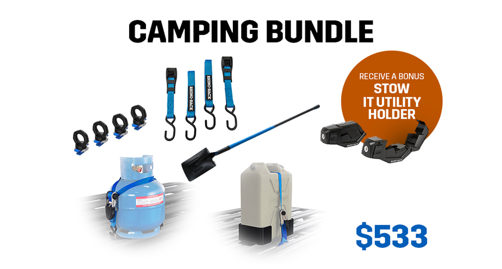 The Camping Bundle is your ultimate companion for outdoor adventures. This bundle includes our Gas Bottle Holder, Single Jerry Can Holder, Eye Bolts with Zwifloc (x4), Tie Down Straps (x2) and our Rhino-Rack Shovel. Plus receive a bonus STOW iT Utility Holder (regular) valued at $135 to ensure you're fully equipped for packing all camping essentials for your next adventure. This easily integrated set up means you can spend more time relaxing and less time setting up and packing down.