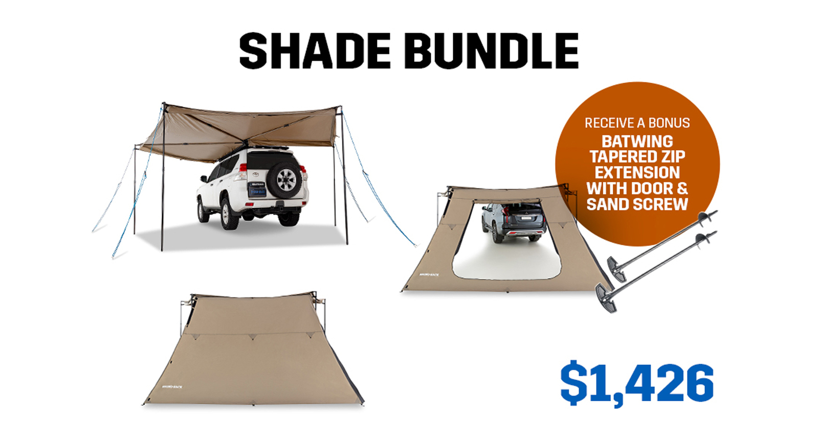 The Rhino-Rack Shade Bundle is your solution for sun protection and outdoor comfort. This bundle includes our Batwing Awning (Left or Right) with STOW iT compatibility for easy setup and shade and the Batwing Tapered Zip Extension for expanded coverage and privacy. Plus receive a bonus Batwing Tapered Zip Extension with Door and Sand Screws valued at $294 for additional coverage and secure anchoring in various terrains. Enjoy your outdoor adventures while staying cool and protected with the Rhino-Rack Shade Bundle.