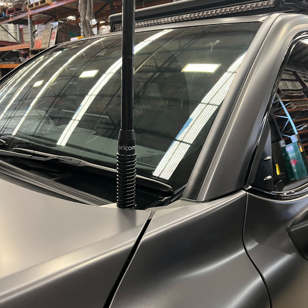 Made in Australia from 4mm thick stainless steel, the mount delivers superior strength, durability, and corrosion resistance — built to withstand the harshest off-road conditions. It positions your antenna in a safe and practical location, clear of bonnet and wiper movement, while maintaining an uncluttered appearance.